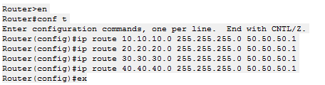 Router(config)#ip route 40.40.40.0 255.255.255.0 50.50.50.1