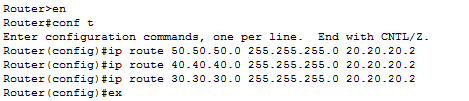 Router(config)#ip route 40.40.40.0 255.255.255.0 20.20.20.2